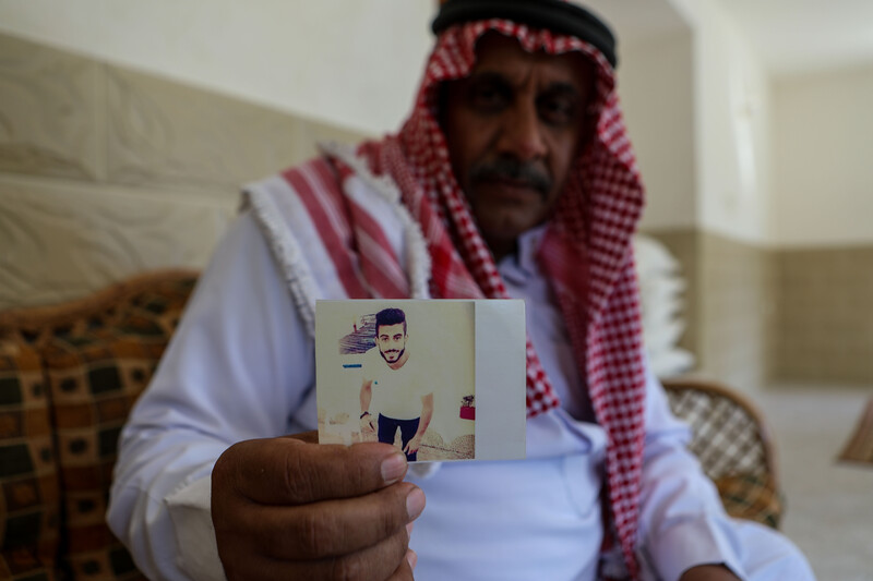 Abed Rabbo al-Nabahin holds a photograph of his son Muhammad, who is imprisoned by Israel.