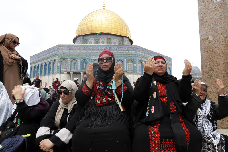 Palestinian woman pray in front of the Dome of the Rock at Jerusalem’s al-Aqsa mosque compound on 22 April.